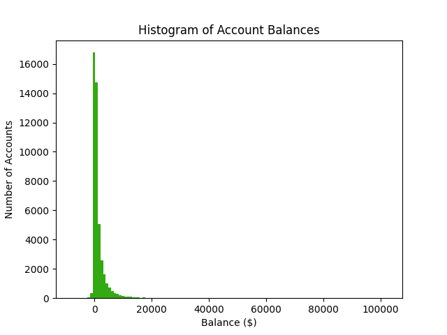 You might be wondering what I mean by huge or extreme values. Consider the bank account balance example from a previous learning python article. Most customers had account balances near zero. The largest account balance was $102,127. The second largest account balance was only $32,892. Wealth is an excellent example of fat-tailed distributions. Most people only have a small amount of assets. A very small amount of people have a huge net-worth.